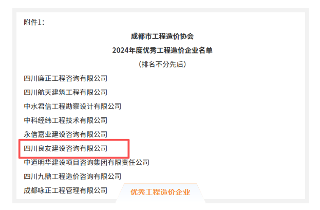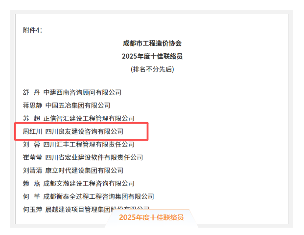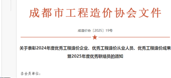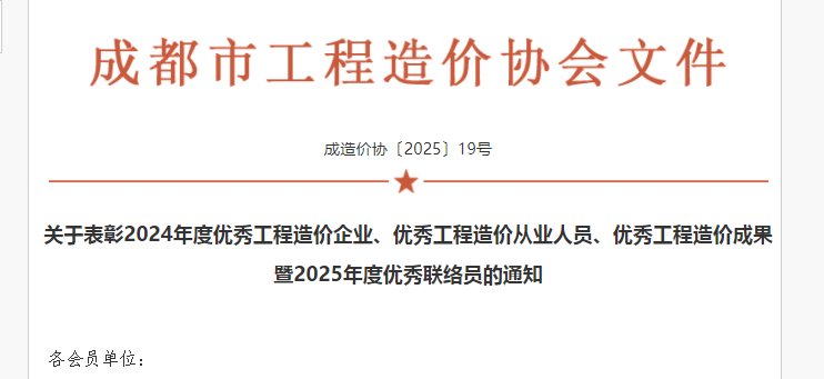 近日,成都市工程造價協會發布了《關于表彰2024年度優秀工程造價企業、優秀工程造價從業人員、優秀工程造價成果暨2025年度優秀聯絡員的通知》,我司憑借專業實力與突出貢獻,斬獲多項殊榮。