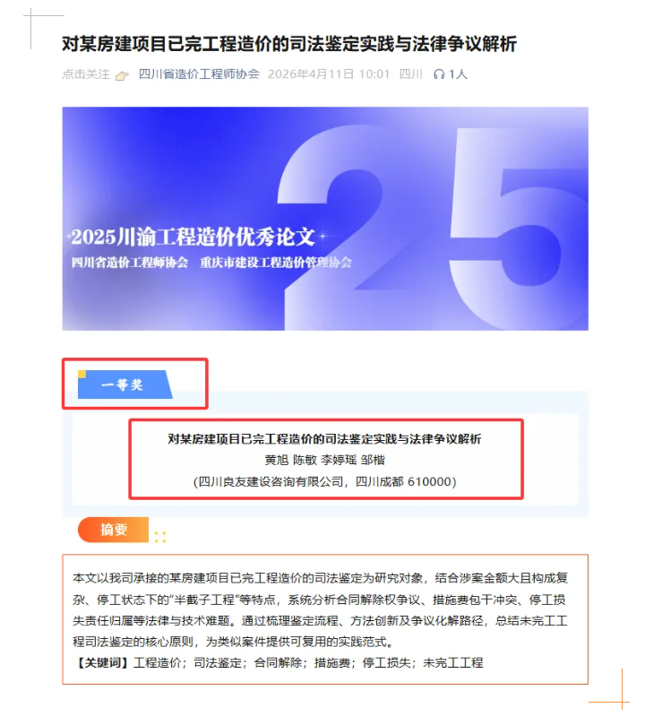 經過嚴格評審,我司選送的學術論文——《對某房建項目已完工程造價的司法鑒定實踐與法律爭議解析》成功入選并榮膺一等獎!這是對我司在工程造價司法鑒定領域專業實力的最高肯定,更是對我司長期深耕該細分賽道、積累了大量復雜鑒定項目實戰經驗的有力證明。